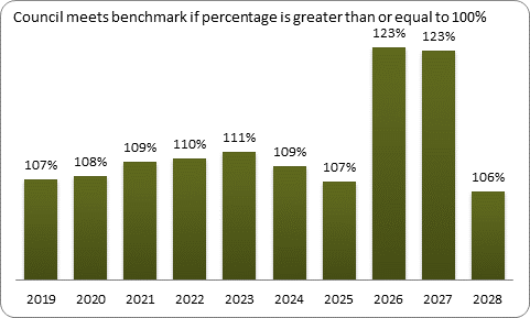 The following displays the Council's forecast balanced budget benchmark for each of the ten years of the LTP. The balanced budget percentage represents the Council's planned revenue (excluding development contributions, financial contributions, vested assets, gains on derivative financial instruments and revaluations of property, plant or equipment) as a proportion of planned operating expenses (excluding losses on derivative financial instruments and revaluations of property, plant or equipment). The Council meets this benchmark if its planned revenue equals or is greater than its planned operating expenses.