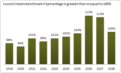 The following displays the Council's forecast balanced budget benchmark for each of the ten years of the LTP. The balanced budget percentage represents the Council's planned revenue (excluding development contributions, financial contributions, vested assets, gains on derivative financial instruments and revaluations of property, plant or equipment) as a proportion of planned operating expenses (excluding losses on derivative financial instruments and revaluations of property, plant or equipment). The Council meets this benchmark if its planned revenue equals or is greater than its planned operating expenses.