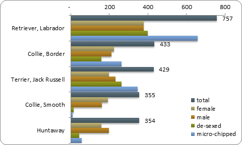 4. Dog registration forms allow owners to identify a primary and secondary breed for each dog. For the purpose of these statistics, the term “pure breed” refers only to those dogs that were registered without a secondary breed name listed.