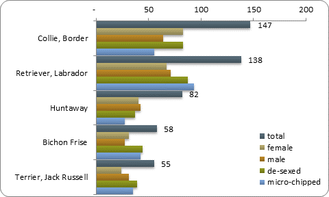 4. Dog registration forms allow owners to identify a primary and secondary breed for each dog. For the purpose of these statistics, the term “pure breed” refers only to those dogs that were registered without a secondary breed name listed.