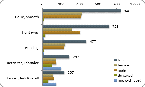 4. Dog registration forms allow owners to identify a primary and secondary breed for each dog. For the purpose of these statistics, the term “pure breed” refers only to those dogs that were registered without a secondary breed name listed.